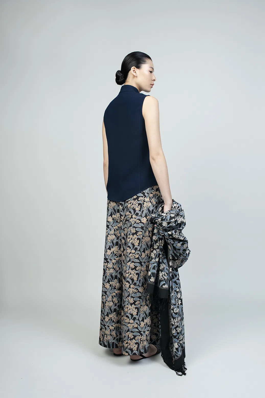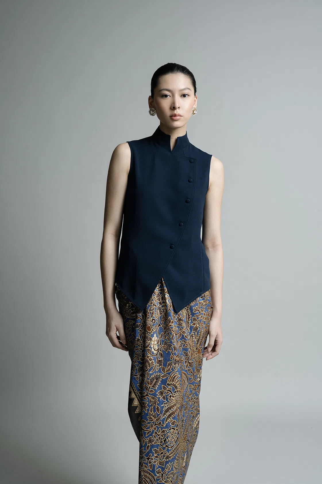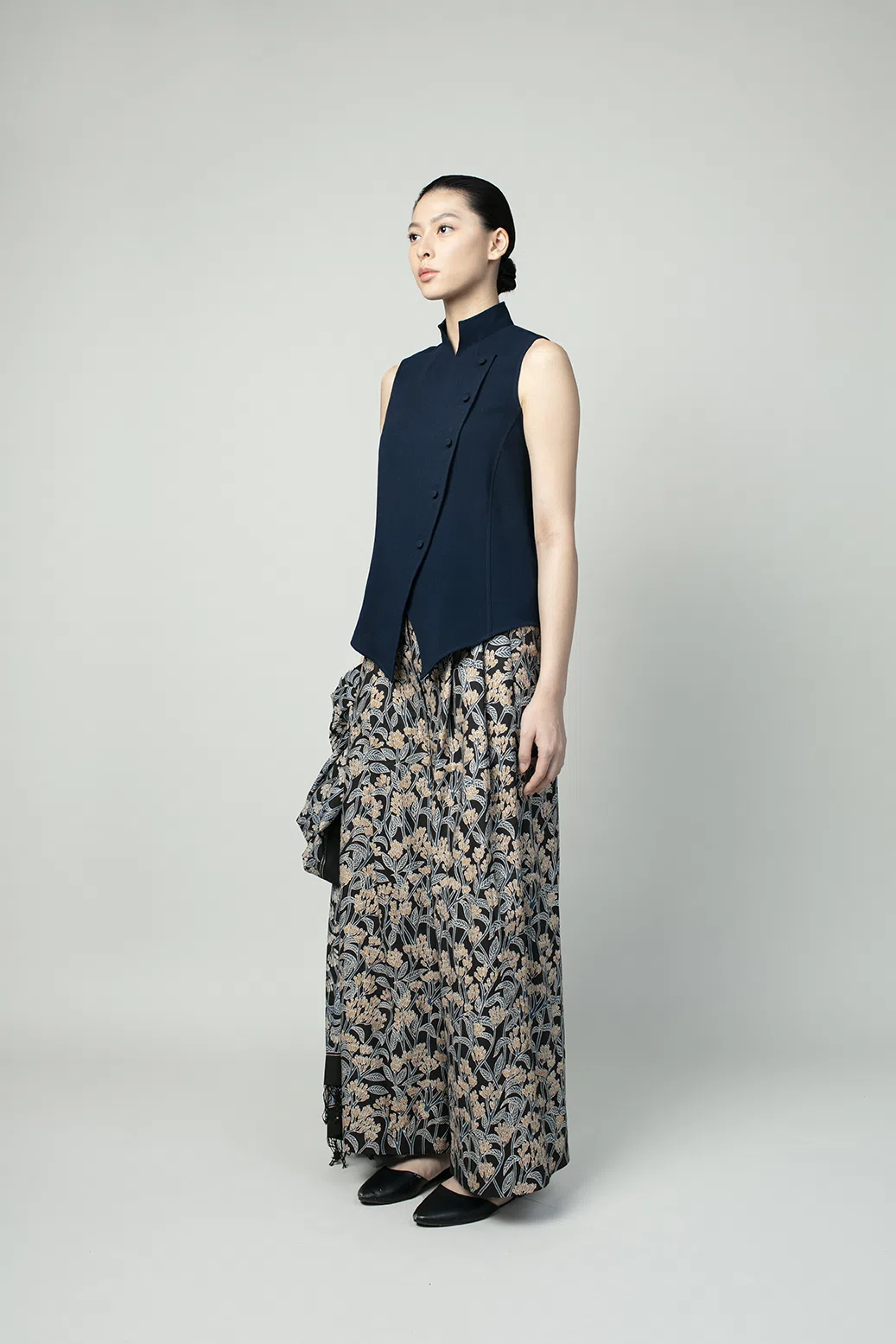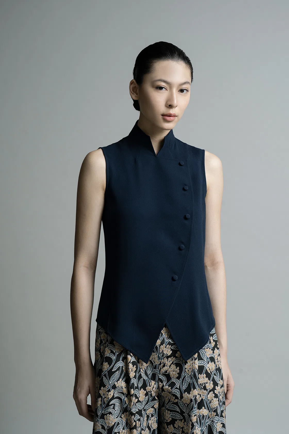 The modernized "Janggan" top is a unique blend of traditional and contemporary styles, featuring a high collar detail and overlapping front body with wrap-around button details. The addition of side body cuts enchances the silhoutte, creating a sleek and slimming look.